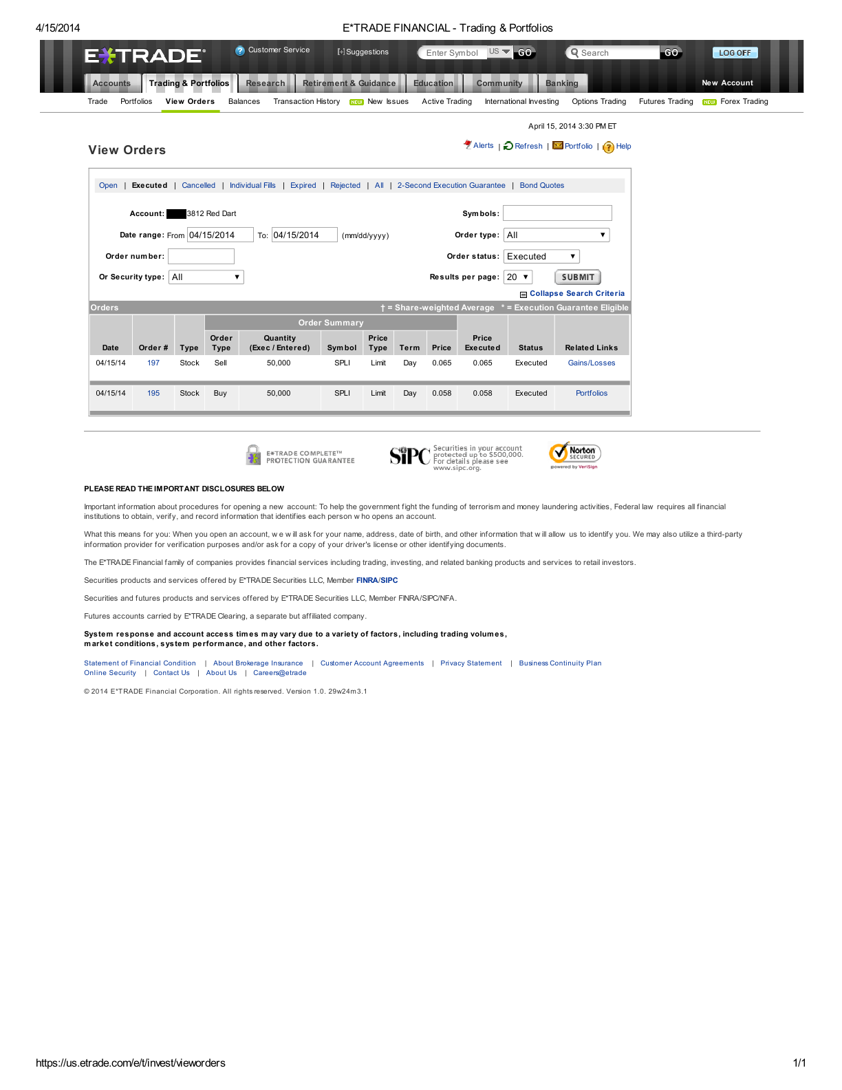 On 4/15/14, I went long 50K shares of SPLI @ $.058. A little less than an hour later I sold it @ $.065 for a 12% gain. (After I sold, Tim Sykes alerted that he bought 386K @ $.07 and added 250K more before closing.) In all honesty, my trade wasn't planned out very well which resulted in missing the huge eod run.