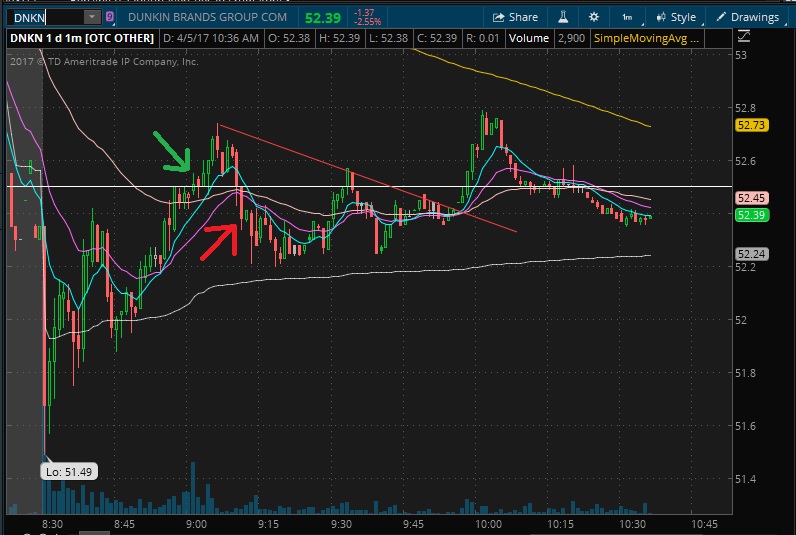 Greedy me. waited the break of 52.50 that was a good breakout point intraday, market green and going up. The only thing I ignored was that the stock was a -2.3% loser on the day. Jumped in at 52.54 and the stock rise to 52.74, I wanted to sell at 52.80 but never got to that price. made an evening star in the 1 min and started to fall I should have sold but decided to wait, stupid mistake.