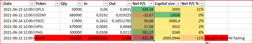 Best winners DPLS and PHIL , lost a lot of dip buys opportunities on both of them , dip buy is definitively my new weapon props to Tim Sykes who teaches me . My big looser for the 2nd time is RSHN chassed it into the weakness trying to guess the bottom , no panic just PM fading which is a fatal mistake , but still green in the week , need to weed out this kind of useless plays like RSHN