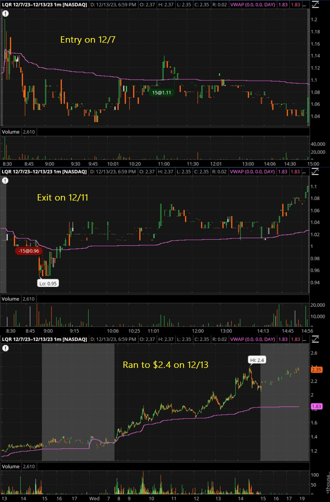 LQR was in jeopardy of being delisted. They did a RS trying to hold $1. It trended lower to 1. I entered @ 1.11, expecting them to put out some PR for it to spike. They had some weak PR, a few days later it fell below $1, and I exited at 0.97 with low confidence that they would promote it. If I had been a little more patient, it ran well above $2 closer to day 10. Pros: I cut my losses as planned. Cons: I should have waited for an entry closer to 1, given myself a better risk level, & patience.