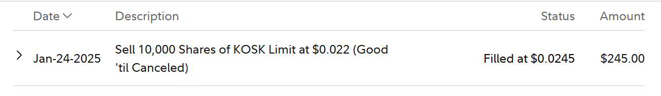 I got in this trade because it was OTC Top 3 Biggest % Gainers with Volume on 1/22 & is a 3-time former runner since 8/15/23. Dip bought 1/23 14:20 $0.02 37% off 8:30 $0.0321 HOD & at 1/22 strong Bid support. Volume dried up. On 1/24 when I saw $0.022 Bids getting taken out & only 10 trades 8:30-9:21, I hit the $0.022 Bid & Fidelity gave me 9:22 $0.0245.