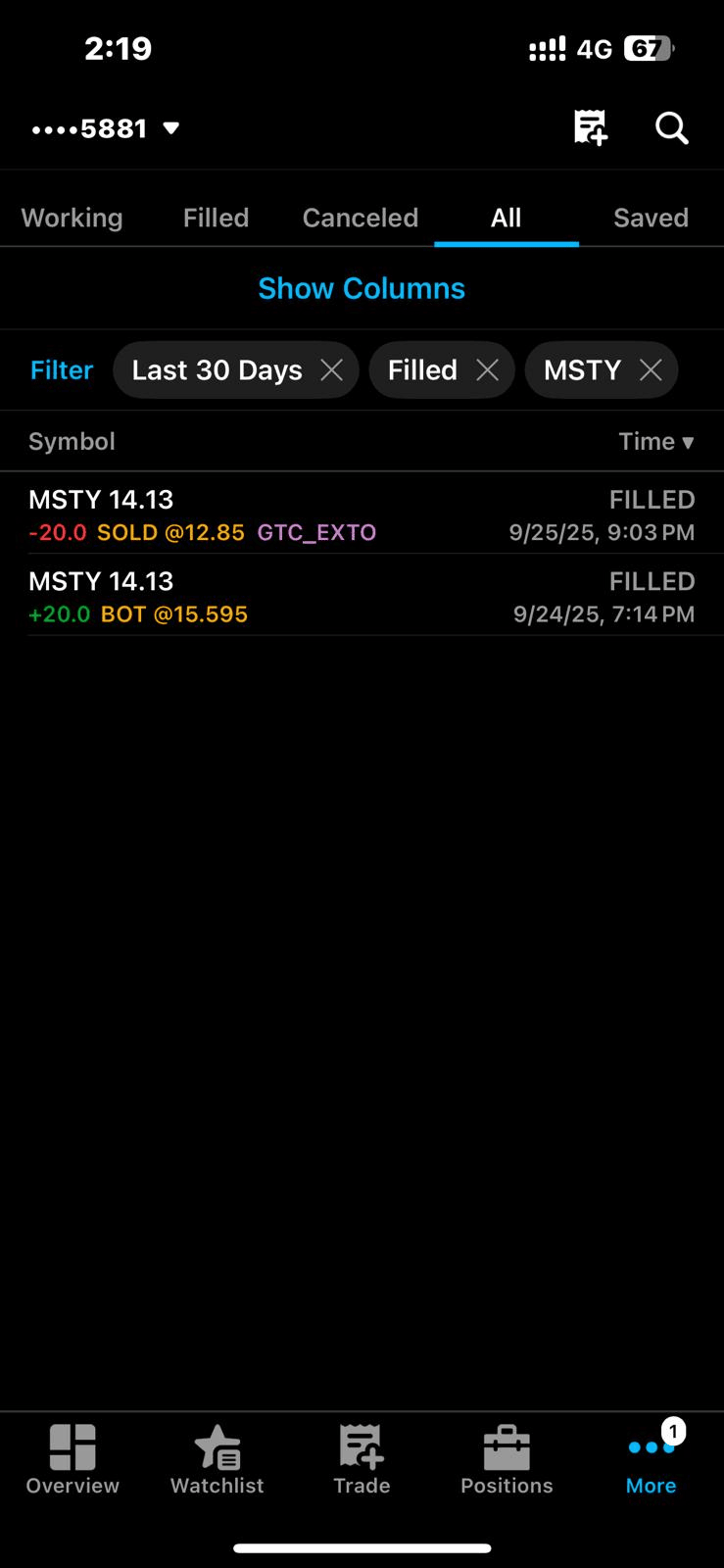 Tried this btc related stock for the dividend, but it had a huge gap down into the day where dividend can be claimed. i tried to hold longer and sell into a bounce but it sold off all day. when i finally was sick of the loss being over $50 i sold into the 13.00 crack, turned out to be low of day. I did make the dividend of $1 per share so the loss was smaller at $35 ish, i planned to risk $1 a share so worst case breakeven but it gapped down $2 /share , good lesson, +7 hrs ahead for time zone