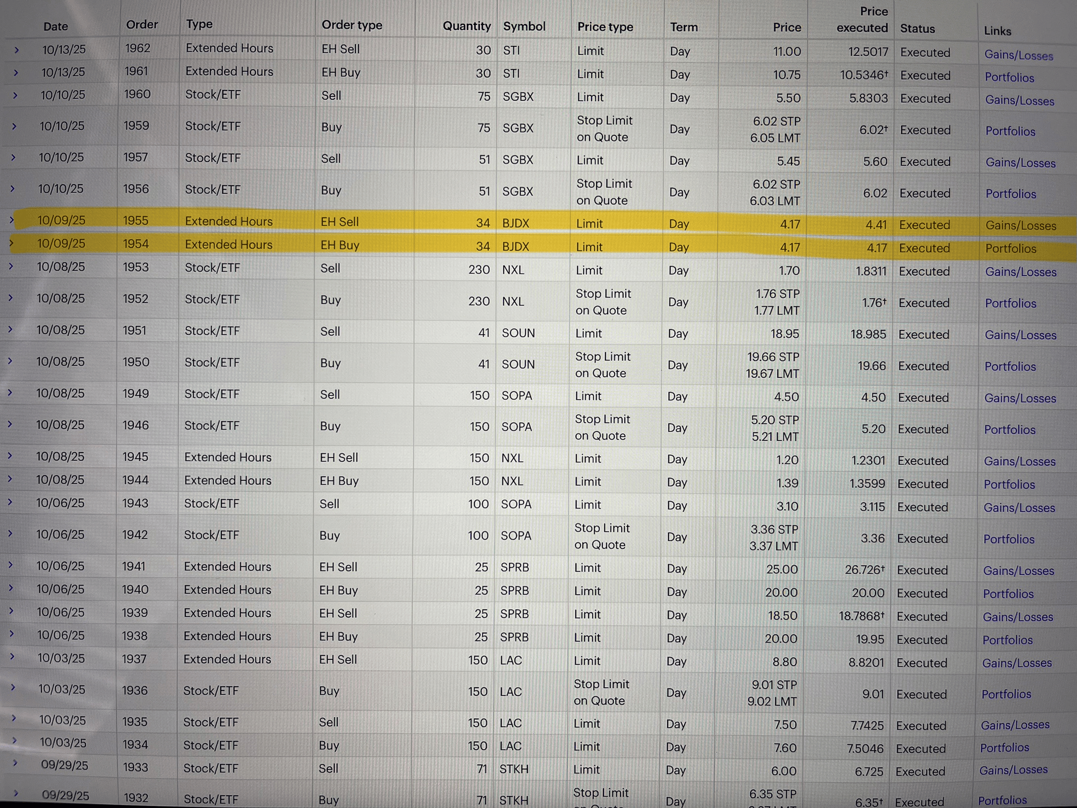 Entry date Oct 9, 2025: Bought 34 shares of BJDX for $4.17. RCT play, bought in pre-market when it hit the top body of the first red 5-min candle, big % gainer with news, 7.4x float rotation, 1.48M float, former spiker. Goal was $1.80 spike. Risk/reward was 1:2, .90¢ downside $1.80 upside. Exit date Oct 9, 2025: Sold 34 shares of BJDX for $4.41. Was spiking nicely, gave it time, couldn’t break M/R, sold when it showed weakness, ended up spiking, need to analyze chart better.