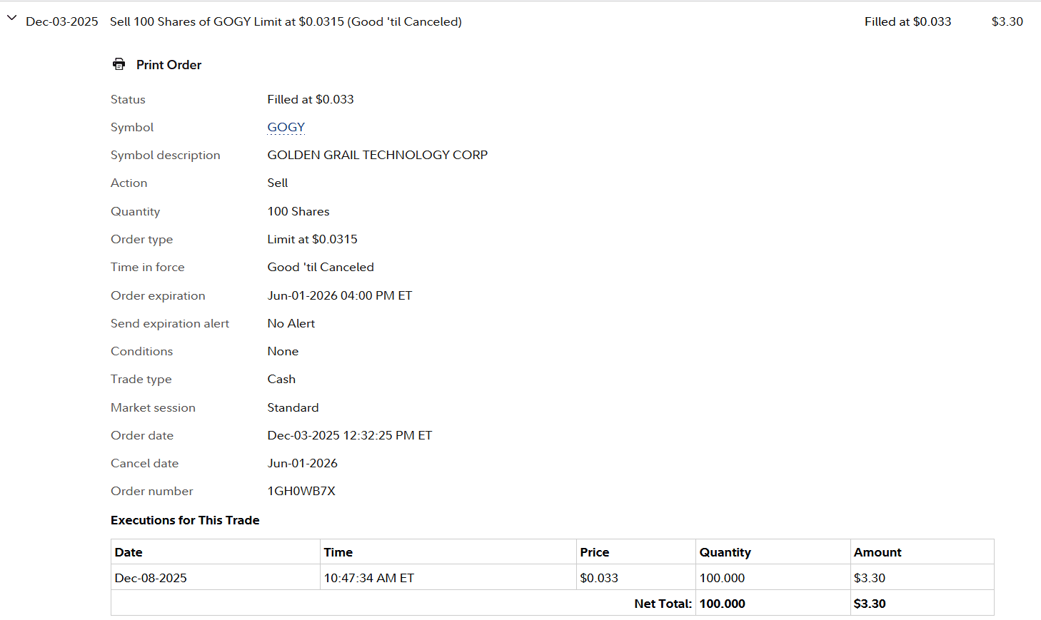 I got in this trade because it was OTC #1 Biggest % Gainer with Volume on 10/29 but NOT a former runner so just seeing what can happen here. Dip bought 12/3 10:10 $0.021 100 shares lol [wanted 13k shares] at general support area on the 10-day daily. Volume was terrible, <24k shares for the whole day, so I cancelled my order & immediately put my Limit Sell at $0.0315 for the 50% win. Fidelity got me out 12/8 9:47 $0.033... only 220 shares traded today yikes stay away!