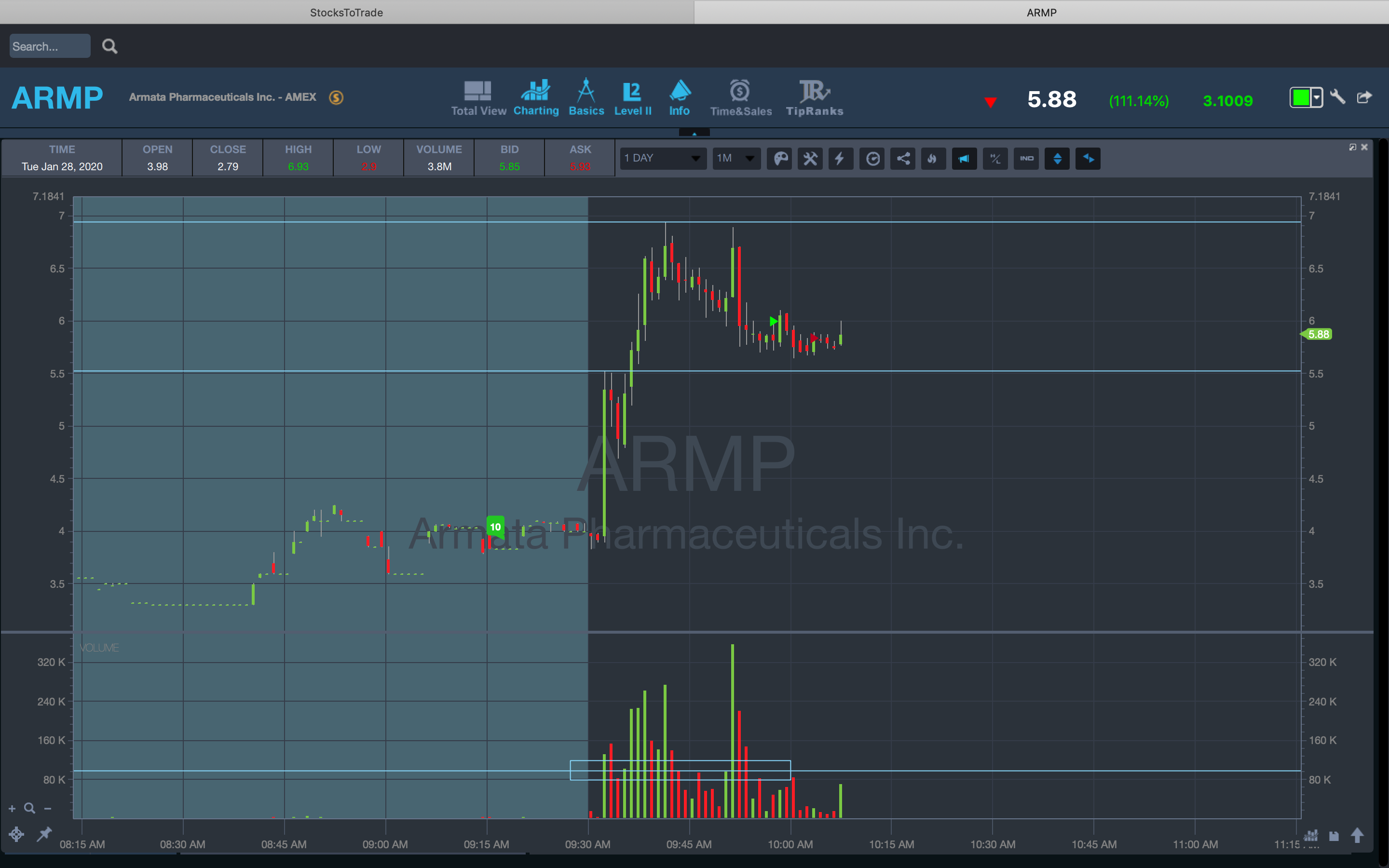 STT scanner hit ARMP. Was 90 on the Sykes scale. Missed the opportunity at the second breakout at $5.50. Was looking for a dip buy opportunity. A 20% pullback was around previous resistance at $5.50. Planned to enter at $5.50 if price hit the level and found support. Didn't quite get there. Entered at $6 with mental stop loss of $5.90. STT was slow to execute, and price went against me. Had issues trying to exit the trade. Eventually got out at $5.84. Will try executing trade directly on eTrade mobile app instead. This freaked me out... and then a few minutes later price did exceed target of $6.30. Overall a good trade, would have preferred a deeper and large cliff dive action for dip buy.