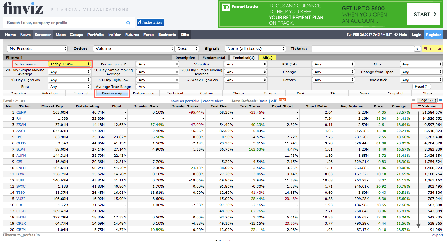 1. go to www.finviz.com > screeners > performance > filter 'Today +10%' / Sort list by Volume (right column)