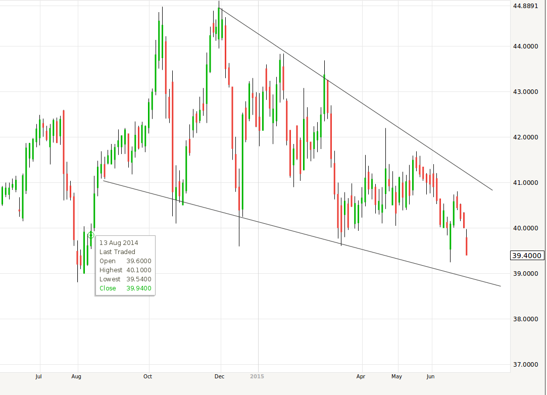 Coca Cola company is in a falling wedge pattern. The moment is of great uncertainty, but it seems a good opportunity to own a good stock at a decent price. I will try to start a small position of just 20 shares tomorrow, limit price 39.25